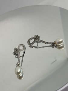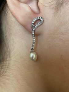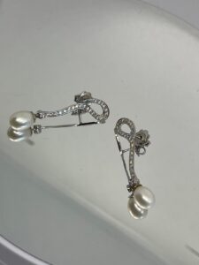 Pendientes largos de oro blanco con circonitas y perlas cultivadas.
